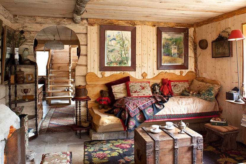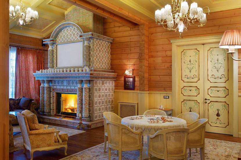 Гостиная деревянного дома в русском стилеИсточник kontio.com Оформление интерьера под старинуИсточник roomester.ru