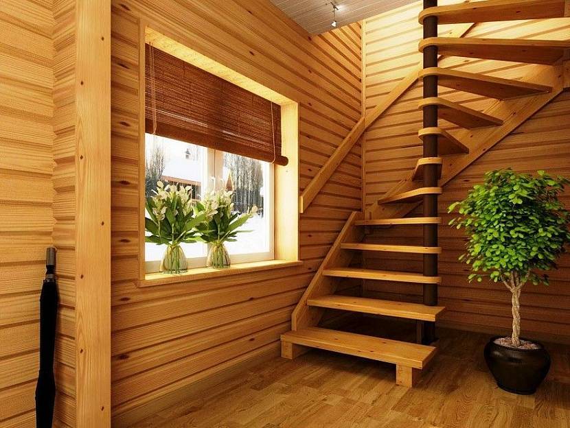 Деревянная лестница на второй этаж, экономящая пространствоИсточник www.zvonkiidut.ru