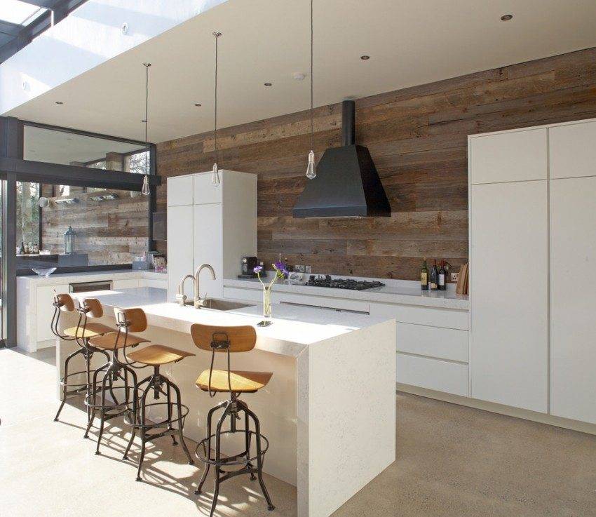 Для отделки ламинатом стен кухни нужно выбирать материал с самыми высокими прочностными характеристики. Также он должен обладать хорошей влагостойкостью и теплоустойчивостью, так как это помещение, где присутствует высокая влажность и нередки перепады температур. Если решено использовать ламинатную доску для отделки стен на кухне, нужно позаботиться об устройстве мощной вытяжки. Этот материал отличный вариант для зонирования барной стойки или обеденной зоны.