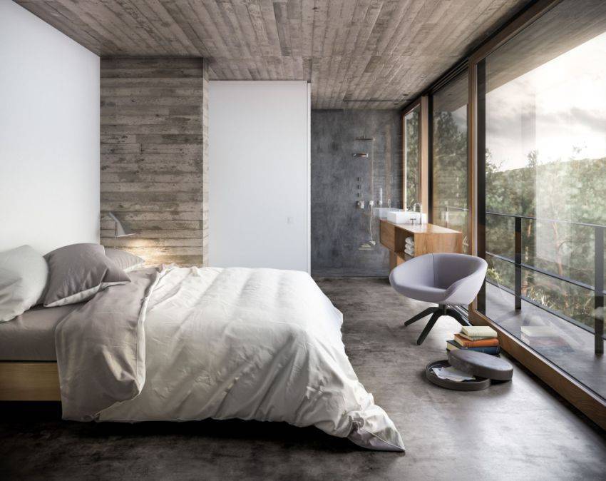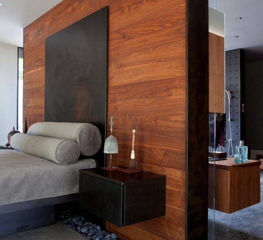 Прекрасно могут смотреться ламинированные панели, плавно переходящие с пола на стену, как бы очерчивая квадрат, занимающий спальную зону. Также можно прибегнуть к более простому решению, оформив стены в светлый тон, а пол традиционно темным цветом. Такой способ создаст контраст и образно расширит стены.