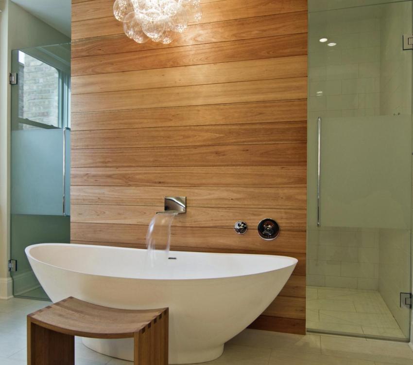 Ванная комната — помещение, в котором экстремальным нагрузкам подвергается практически любой отделочный материал. Здесь очень высокая влажность, пар и постоянные перепады температур. Для отделки стен ламинатом в ванной понадобятся ламели с самым высоким классом прочности. Предпочтение отдаётся водо- , а не влагостойкой ламинатной доске, которая прослужит довольно долго и позволит создать неповторимый интерьер.