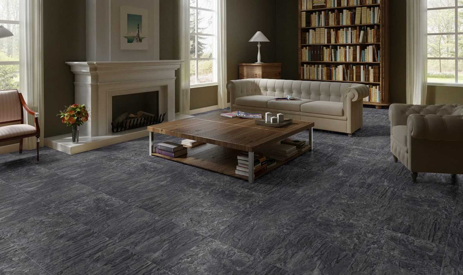 Покрытие под бетон, камень или гранит зрительно увеличивает комнату. Панель с глубоким рельефом красиво смотрится в бежевом, нежно-коричневом или холодном сером цвете. Ламинат гармонирует с белыми и темными оттенками мебели. На теплом полу не видны разводы и пыль.