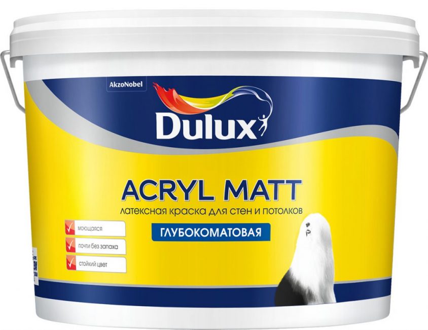 Смесь также известна как водоэмульсионная краска, но обладает повышенной износостойкостью и может применяться в помещениях с повышенной влажностью. Из недостатков следует отметить подверженность ультрафиолетовым лучам, под действием которых она быстро выгорает.