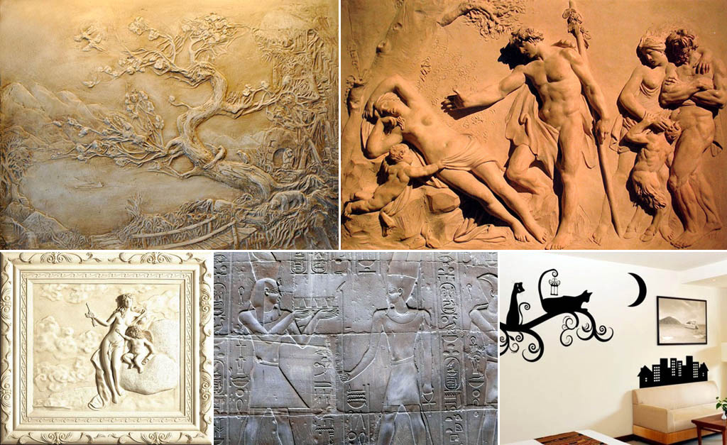 Первые изображения барельефа в обязательном порядке должны были содержать в своей композиции фигуру человек. Сейчас этот атрибут необязателен. Тематическая направленность, а также количество панно, габариты зависят от общей площади помещения.