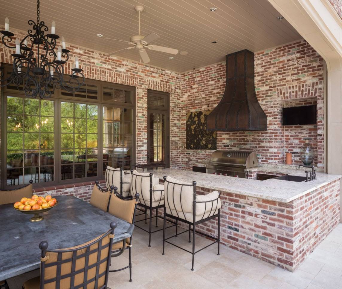 Кирпичные кухни строятся обеспеченными владельцами для эстетичности и долговечности сооружения. Конструкции делают закрытыми или полуоткрытыми на ленточном фундаменте. Стены возводят профессионалы из кирпича или пеноблоков. Во втором случае для внешней красоты строение отделывают фасадной плиткой или декоративной штукатуркой. Каркас крыши сооружают из дерева или металла, из кровельных стройматериалов подходят металлочерепица или мягкая черепица. В полуоткрытых вариантах можно установить панорамные окна и двери или закрыть отверстия плотными шторами.