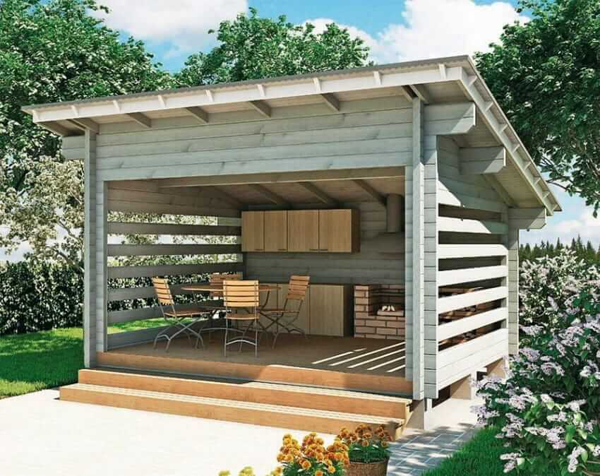 Если считается, что стены для приготовления еды не нужны, то в прохладную, ветреную погоду расположение за столом комфортным не будет. На постройку открытого типа уйдет меньше строительных материалов, причем для приготовления еды можно задействовать переносной мангал. Вариант строения может быть временным либо стационарным. Однако все предметы быта, расположенные в данной постройке (включая посуду и продукты питания), будут в зоне доступа домашних животных, а также насекомых. Такое нравится далеко не всем.