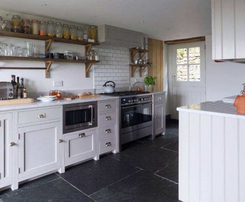 В открытой кухне пол должен быть особенно практичным, идеально подойдет террасная или палубная доска