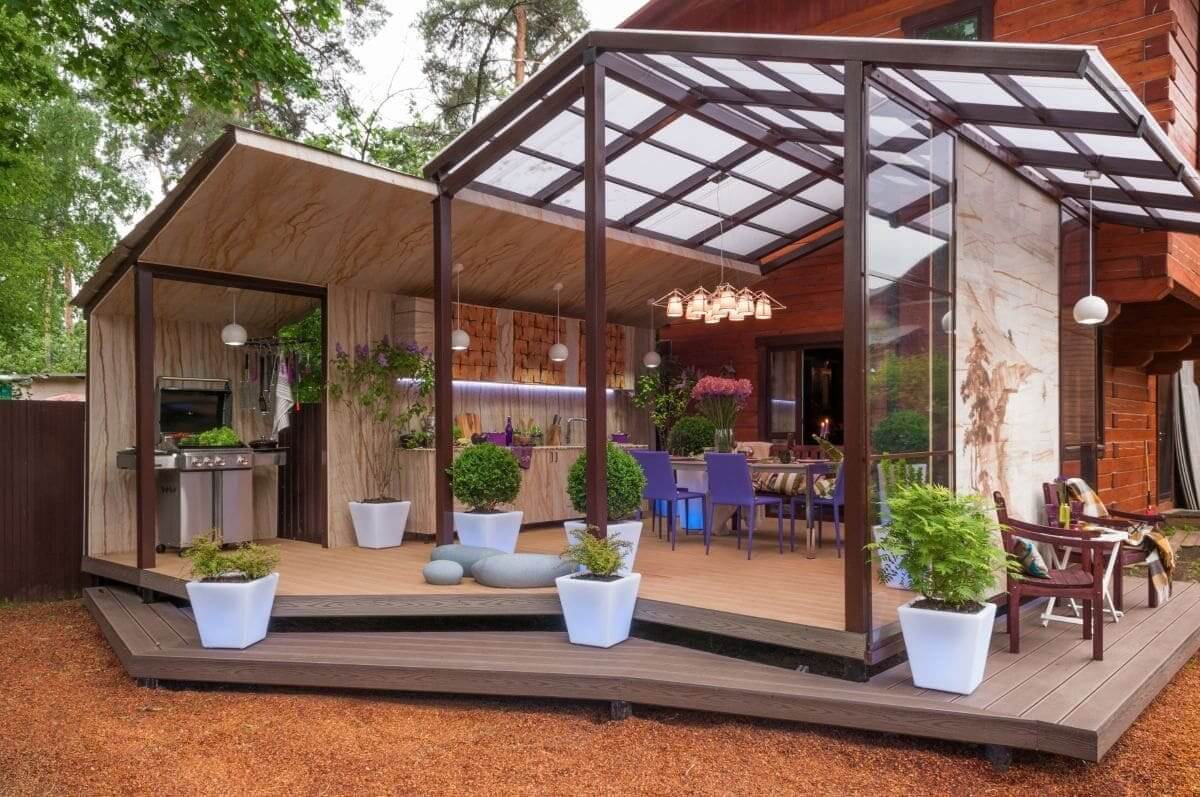 Совмещенная летняя кухня с террасой устраняет проблему дефицита площади. В нее легко вынести столовую область из рабочей зоны. Крыша возводится при наличии времени и материала, а в большинстве случаев ее заменяет навес из цельного листа поликарбоната от 6 мм толщиной.