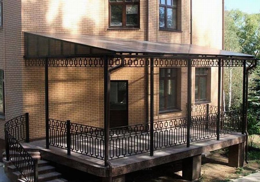 Пример террасы, сделанной из металла. Опоры из профильных труб, ограждения — литые решетки. Прочная, долговечная, оригинальная, красивая, с односкатной крышей.