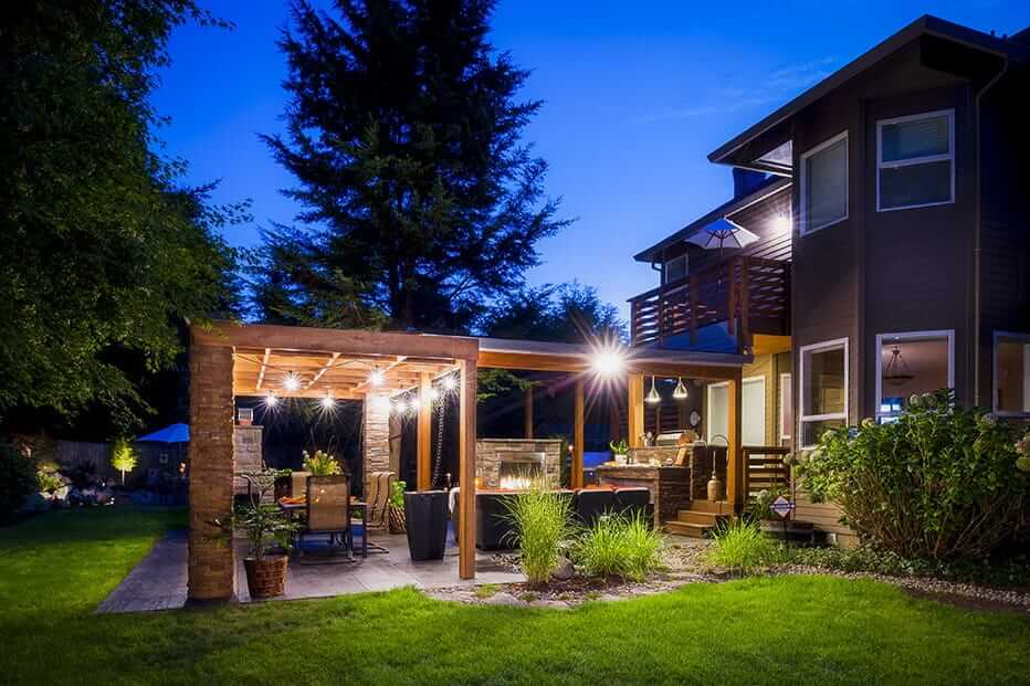 Обратите внимание на то, чтобы конструкция кухни вписывалась в ландшафтный дизайн участка и не выбивалась из общей композиции