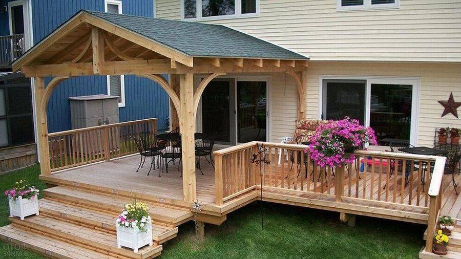 Деревянная терраса с точеным ограждением и оригинальным крылечком, сделанная своими руками под одной крышей с домом.