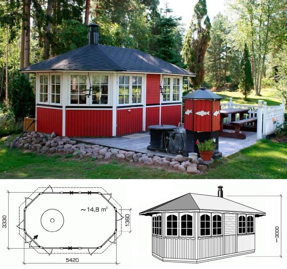 При желании встроить печку или мангал потребуется соблюдение требований пожарной безопасности: расстояние от дерева, пластика и иных быстровоспламеняющихся материалов до источника огня — минимум 2 м. Это накладывает существенные ограничения на площадь самой постройки.