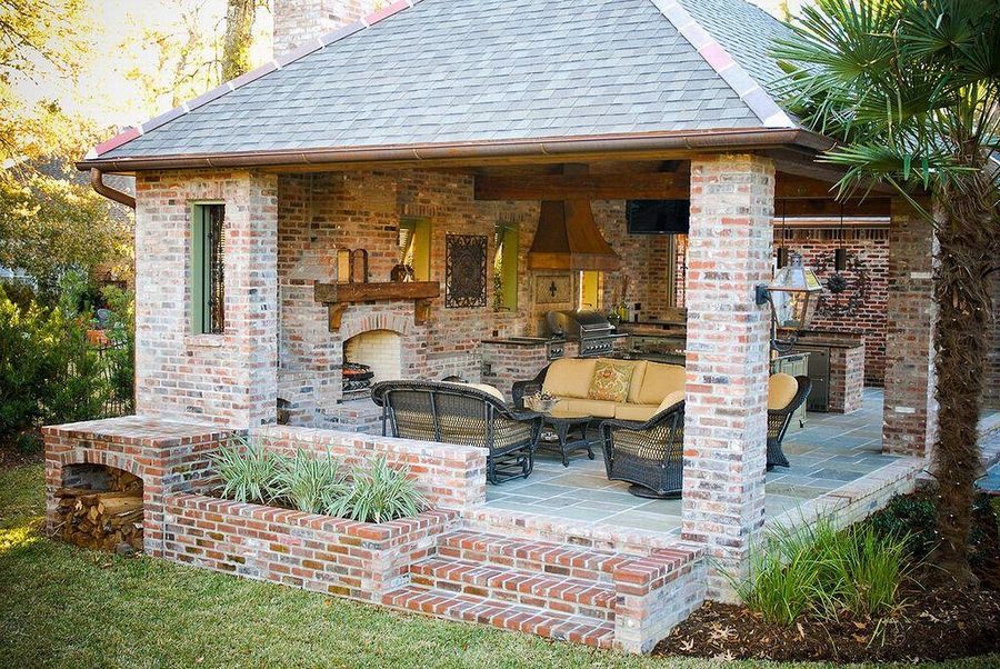 Кирпичные кухни строятся обеспеченными владельцами для эстетичности и долговечности сооружения. Конструкции делают закрытыми или полуоткрытыми на ленточном фундаменте. Стены возводят профессионалы из кирпича или пеноблоков. Во втором случае для внешней красоты строение отделывают фасадной плиткой или декоративной штукатуркой. Каркас крыши сооружают из дерева или металла, из кровельных стройматериалов подходят металлочерепица или мягкая черепица. В полуоткрытых вариантах можно установить панорамные окна и двери или закрыть отверстия плотными шторами.
