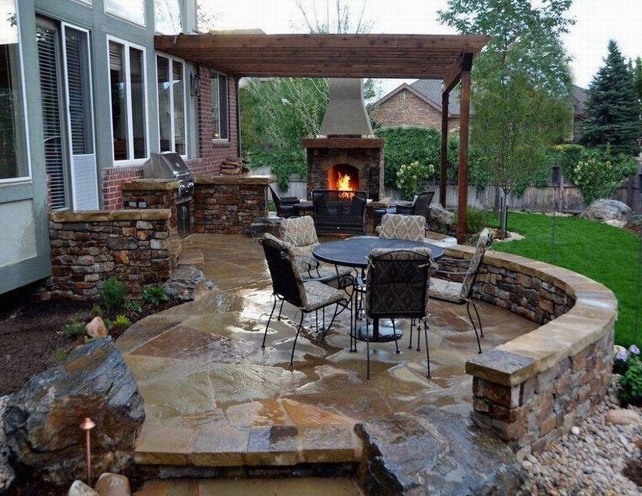 Проект патио террасы на даче своими руками. Пол, опоры, решетчатое основание для крыши сделаны их древесины. Посреди дворика выложен из натурального камня открытый камин, обрамленный столом из древесины.