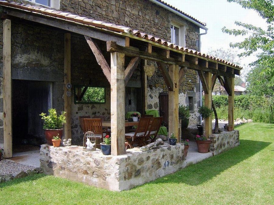 Фото террасы в стиле Прованс. Основание сделано из натурального камня, опорные столбы из деревянного бруса, крыша покрыта черепицей.