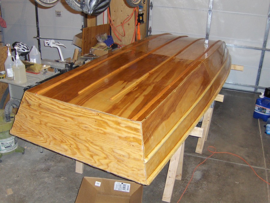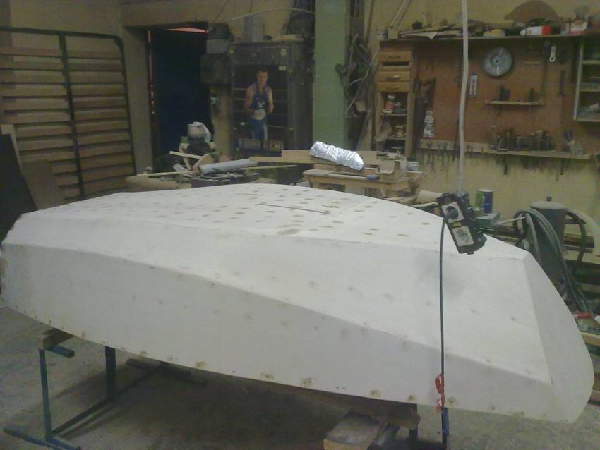 Дождавшись, пока вся конструкция просохнет, снимаем лодку с козлов, переворачиваем ее и шлифуем наружную поверхность. Затем обрабатываем эпоксидной смесью швы и проклеиваем днище стеклотканью.