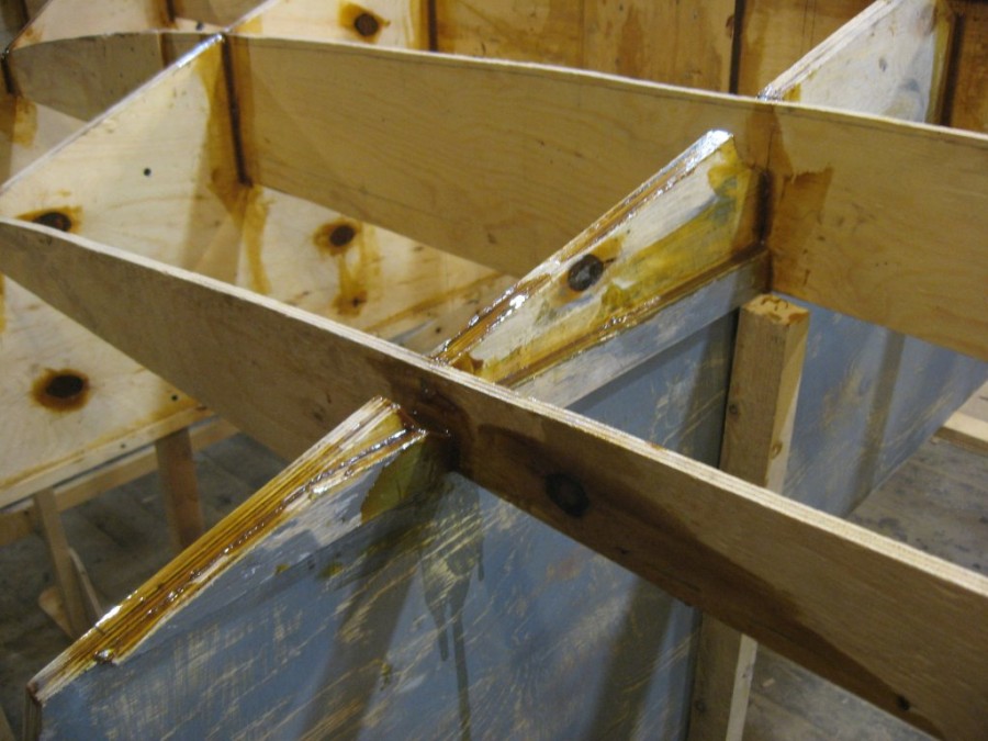 - Для фиксации шпангоутов используем тот же клей. Если габариты судна достаточно велики, то с целью усиления конструкции шпангоуты следует дополнительно зафиксировать на дне и бортах полосами стеклоткани внахлест.
