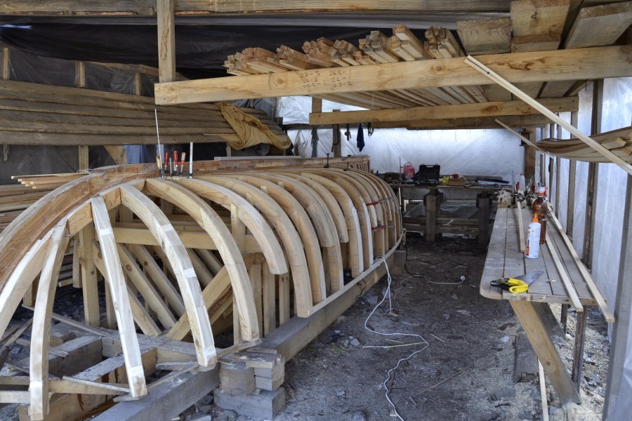 Когда распорка будет правильно установлена можно начинать придавать лодке форму, позовите на помощь нескольких людей или запаситесь веревками, чтобы сдерживать конструкцию.