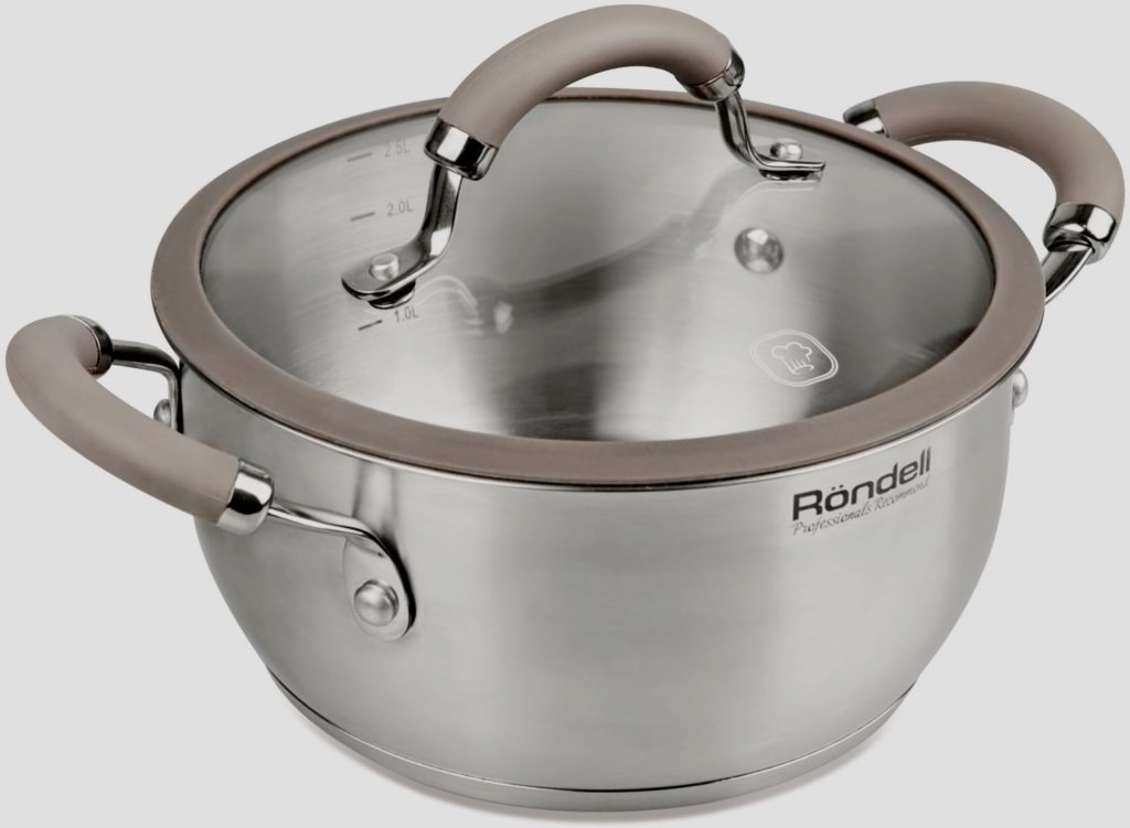 Кастрюля из нержавеющей стали со стеклянной крышкой. Две короткие стальные ручки с креплением точечной сварки. Мерная шкала поможет пользователям правильно рассчитать количество жидкости и продуктов внутри. Объем составляет 4,9 л. Диаметр верха – 24 см. Диаметр дна – 22 см. Высота стенок – 12,5 см. Многослойное дно. Можно использовать в духовке и индукционных плитах, мыть в посудомоечной машине. Средняя цена – 1 800 рублей.