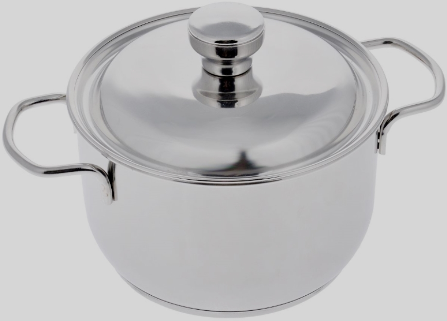 Кастрюля из нержавеющей стали с двумя короткими стальными ручками. Крепление ручек выполнено из точечной сварки. Крышка стальная в комплекте. Объем – 3,5 л. Диаметр верха – 20 см. Диаметр дна – 17,3 см. Толщина дна – 6,5 мм. Толщина стенок – 0,8 мм. Высота стенок – 13 см. Многослойное дно. Возможность мытья в посудомоечной машине. Можно использовать в духовке и индукционных плитах. Средняя стоимость – около 3 000 рублей.