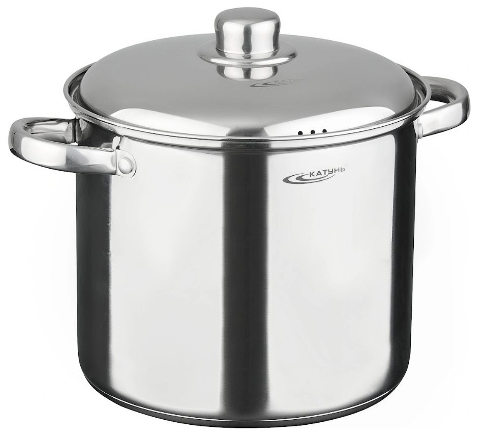 Большая и вместительная посуда, в которой можно варить компоты, варенья, маринады. За изделием легко ухаживать, оно не требует особого ухода, отличается практичностью и долговечностью. При взаимодействии со сталью продукты не меняют вкусовых свойств. Дно изделия толстое, содержит вставку из алюминия. Эта конструкция равномерно распределяет тепло внутри посуды, долго сохраняя его при снятии кастрюли с плиты. В комплект входит крышка из стали. Способ крепления ручек – заклепки. Диаметр верха – 28 см, толщина стенок составляет – 0,6 мм. Вес изделия – 3,4 кг. Средняя стоимость составляет – 1 859 руб.