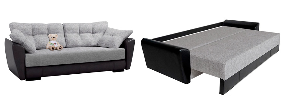 Диван оснащен ортопедическим матрасом, высокой спинкой, широкими подлокотниками. Специальный механизм трансформирует изделие в разложенное состояние. После раскладывания получается место для сна, на котором свободно размещаются два человека.