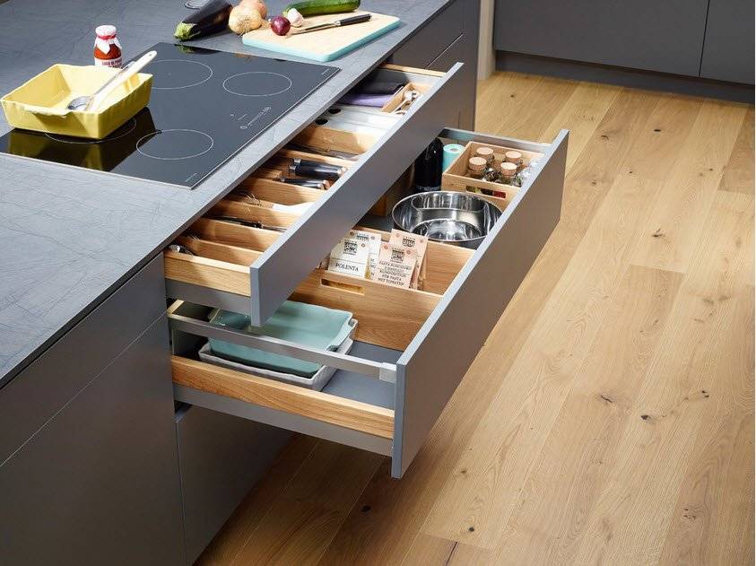 Причём компания «Явид» из массива дуба изготавливает не только корпуса и фасад кухонь. Даже выдвижные ящички изготавливаются из этого материала, что обеспечивает их долговечность и надёжность.