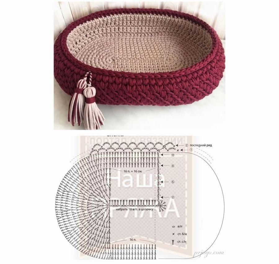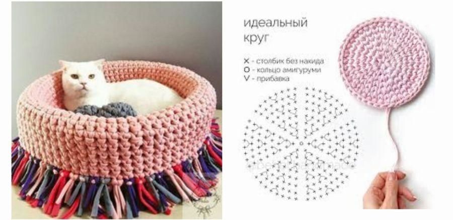 Самой простой считается лежанка круглой формы. Связать ее своими руками можно опираясь на данную схему.