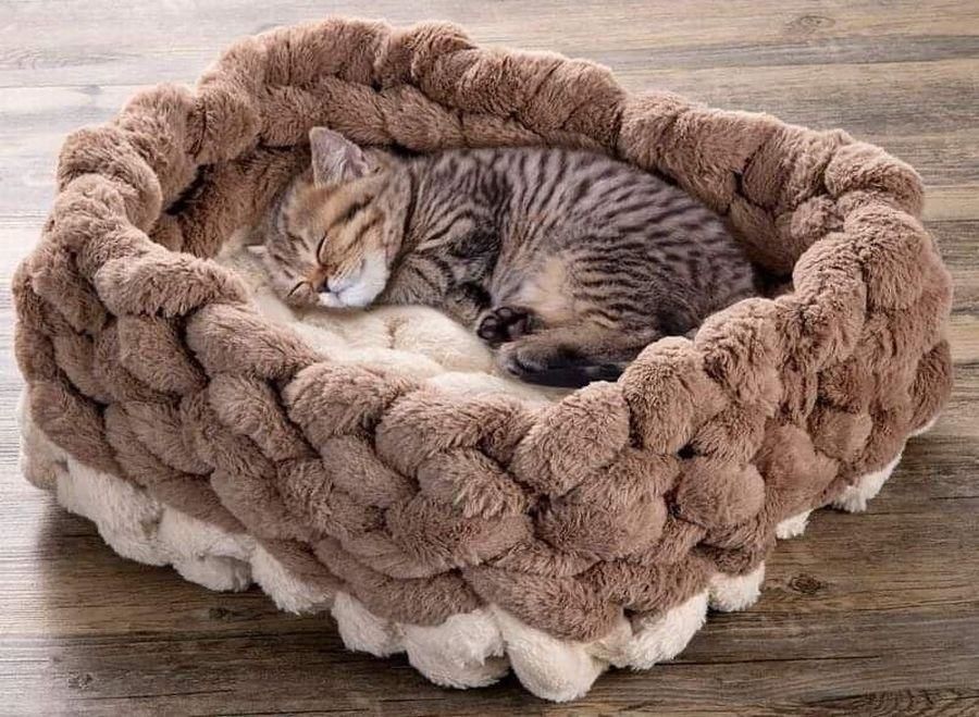 У котенка, который только переехал в новый дом, обязательно должна быть собственная лежанка. В ней он будет чувствовать себя комфортно и безопасно, что позволит быстрее справиться со стрессом. Объемная плюшевая пряжа – идеальный выбор!