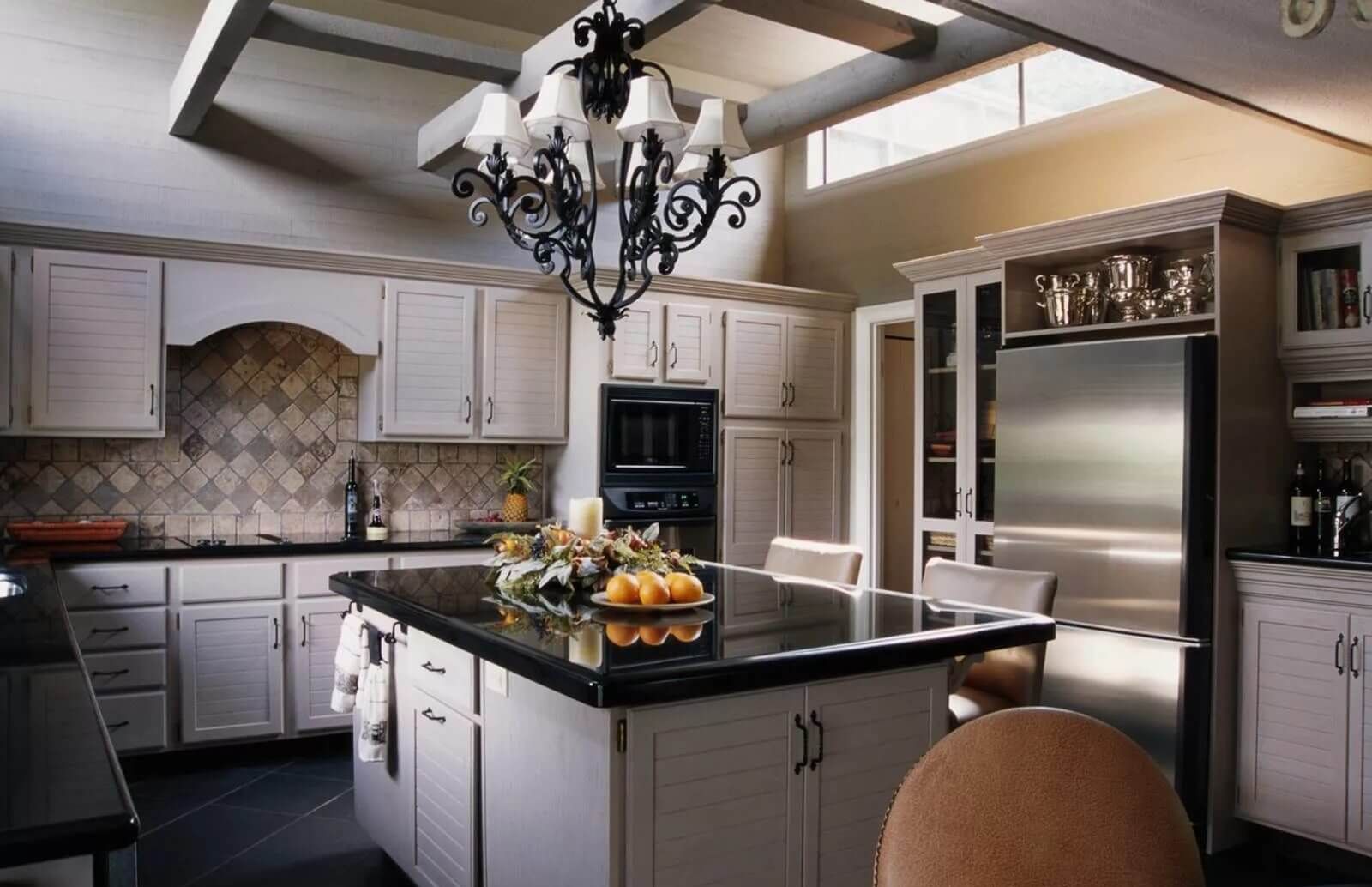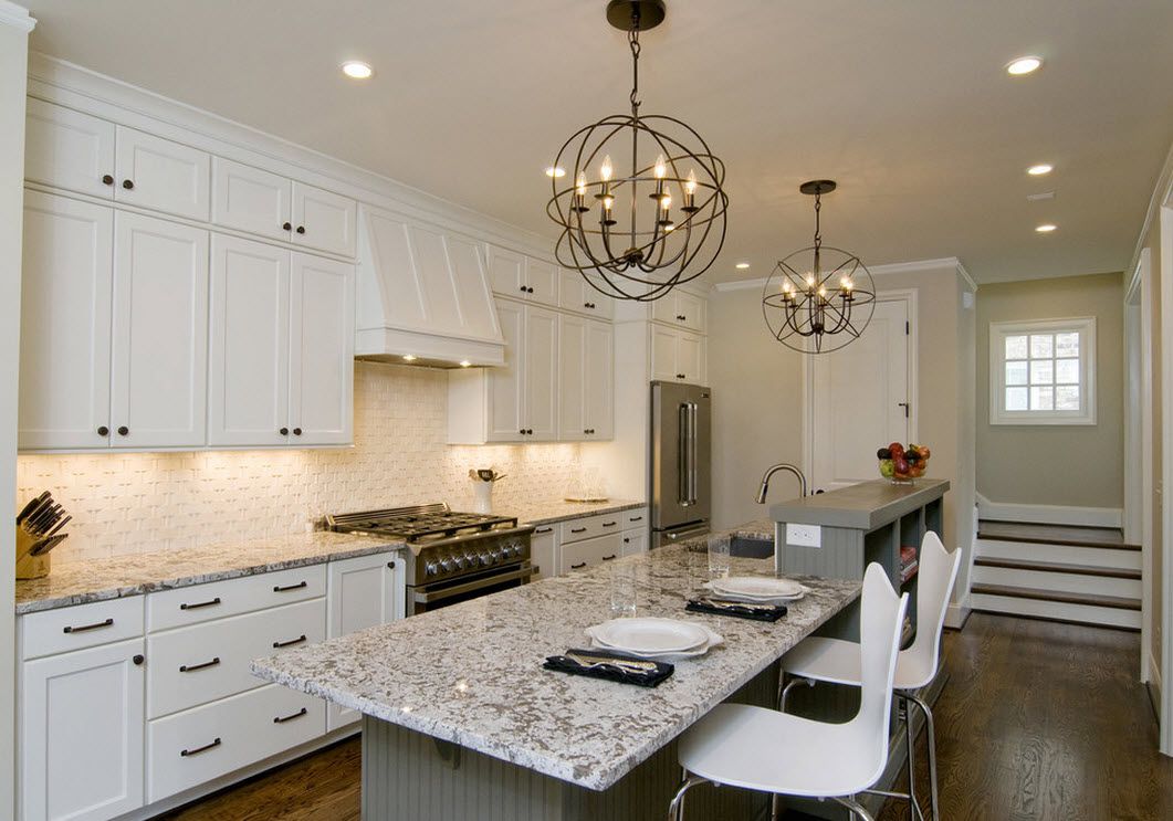 Для современных помещений кухонные люстры в стиле минимализма — лучший вариант. Если это решение вам кажется симпатичным, ищите светильники смелых, но незамысловатых форм с яркой отделкой. Современные светильники часто выполнены в холодных оттенках полированного никеля или хрома, но элегантные черные светильники или гламурные золотые, коричневые и медные также могут найти свое место в модных, передовых дизайнах.