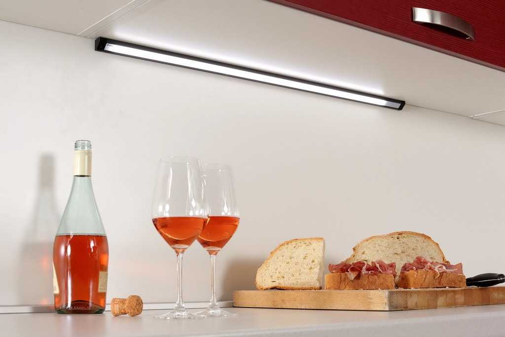 - Рабочая зона должна быть оборудована дополнительным освещением. Лампы или светодиодные люстры можно устанавливать под навесными шкафами.