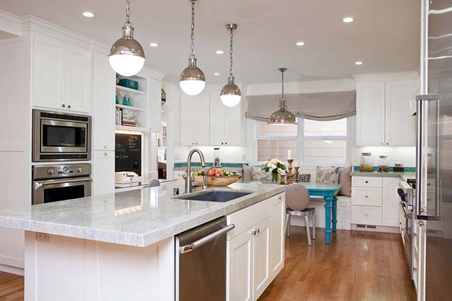 Из-за некоторой специфики комнаты одного источника освещения на кухне, вероятнее всего, может не хватить. Потому его обычно дополняют трековыми либо встроенными светильниками, а основной свет располагают над обеденной зоной либо островком, где необходима основная концентрация освещения.