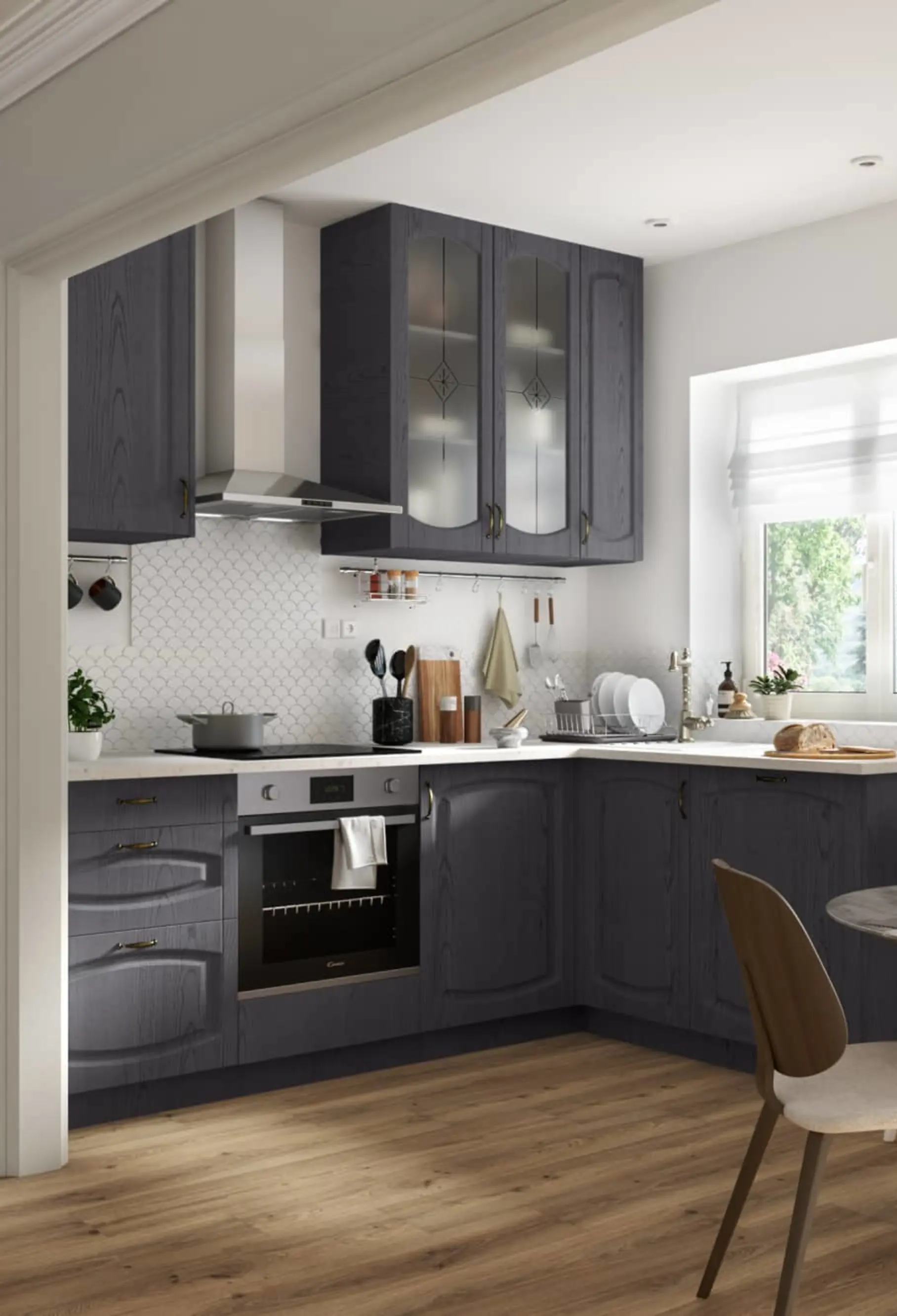Стекло может использоваться в кухонной мебели в качестве столешниц, фасадов или вставок. Оно придает интерьеру легкость и современность. Стекло может быть прозрачным, матовым или цветным. Однако стоит учитывать, что стеклянные поверхности требуют регулярной чистки от отпечатков и пятен.