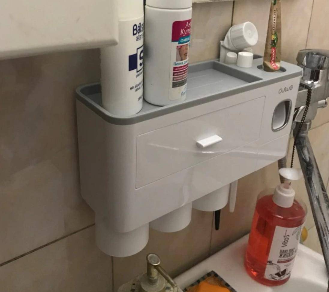 Настенная полка-стеллаж для туалетных принадлежностей, в том числе, держатель для зубных щеток и набор аксессуаров для ванной комнаты. Кто бы мог подумать, что хранение зубных щеток может быть столь технологичным. Вместо того, чтобы привычно оставлять их в стакане, предлагается размещать их на держателях специальных полок.