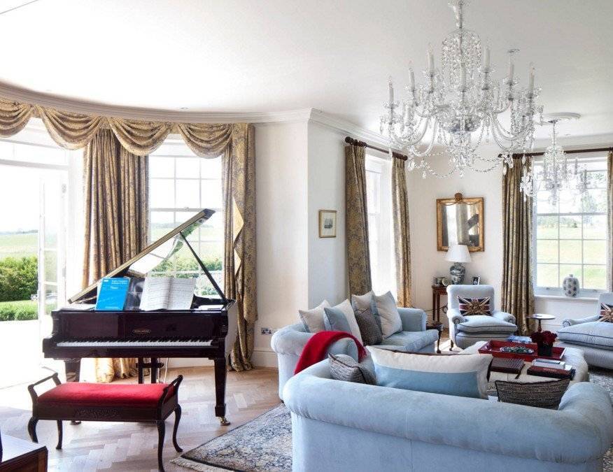 Здесь уделяется внимание каждой детали. Особенно это касается люстры. Для пышного и помпезного интерьера подойдет только роскошный светильник