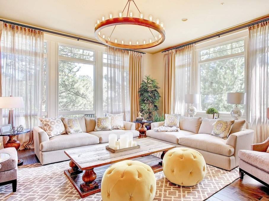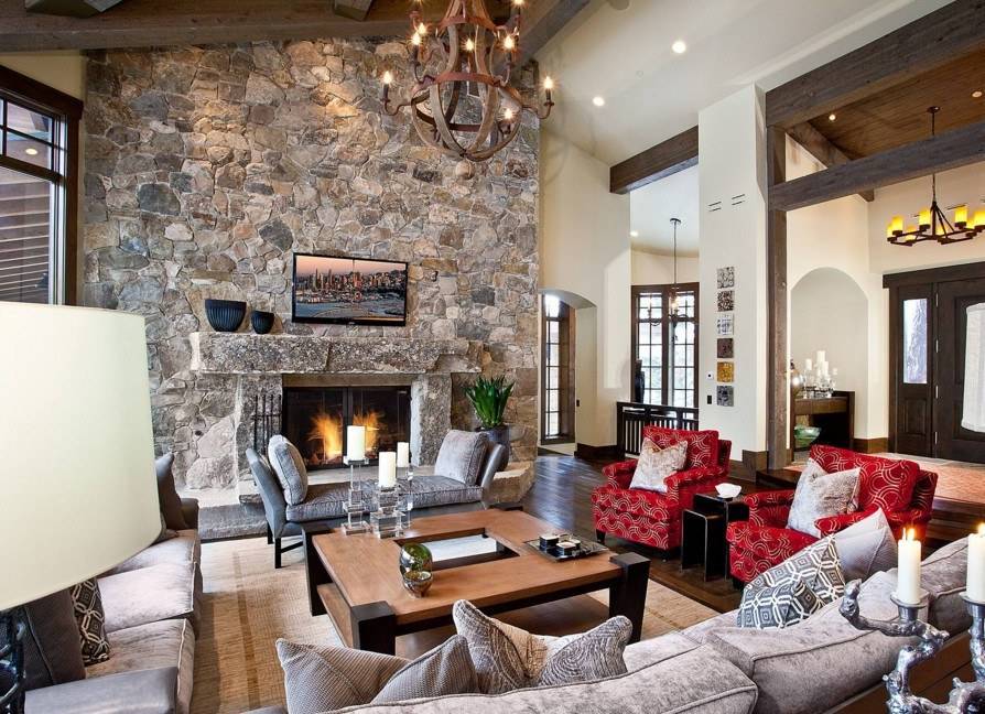 Кантри. Гостиные в подобном оформлении встречаются чаще в загородных домах и дачах. Для них свойственно использование натуральных материалов, таких как ткани или дерево. Осветительные приборы в стиле кантри также имеют в конструкции экологически-чистые элементы. Размеры и цвета люстр зависят от конкретного интерьера.