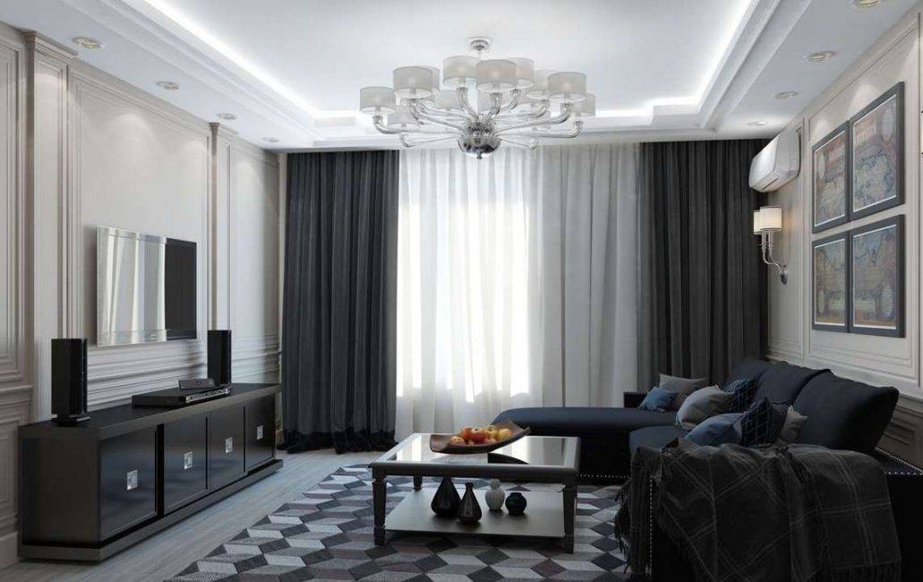 На размер люстры повлияет и форма гостиной. Если комната вытянутая и узкая, то одним из вариантов осветить ее, станет оформление двух небольших люстр. При одновременном включении гостиная заполнится равномерным светом, а если включать одни из источников, то можно выделить отдельную зону в комнате. В маленьких гостиных также лучше повесить небольшую аккуратную люстру, оснащенную светодиодными лампочками, которые наполнят комнату достаточным светом.