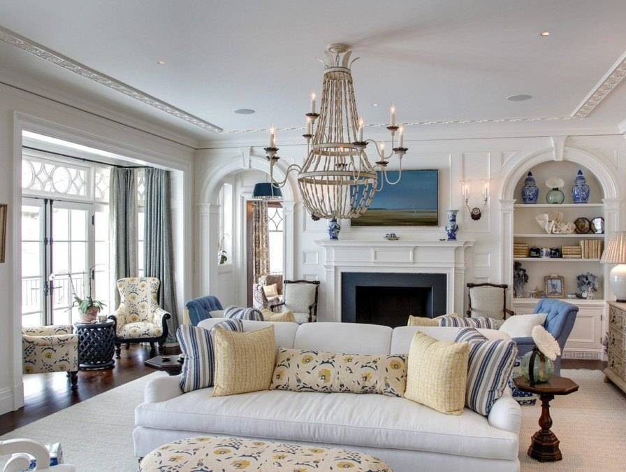Подбор оттенка напрямую зависит от стиля гостиной. В классических интерьерах уместно смотрятся нейтральные осветительные приборы. К ним относятся бежевые, кремовые, прозрачные или белые модели. Такие цвета не перегружают пространство, элегантно вписываются в общую картину.