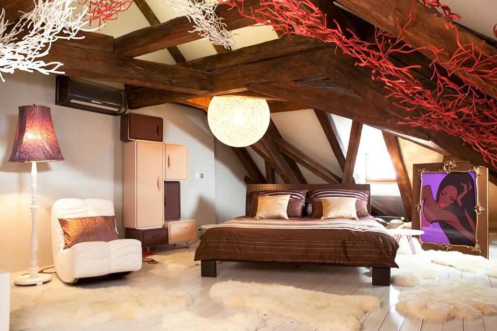 Оригинальный внешний вид люстры прекрасно дополнит интерьер спальни.