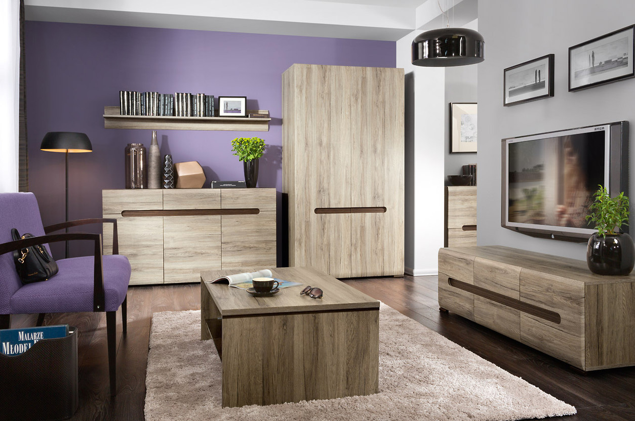 Если задача заключается в акцентировании внимания именно на мебели, ее оттенить от общей картины можно расположив на полу перед диваном коврик и установив возле него журнальный столик со светильником;