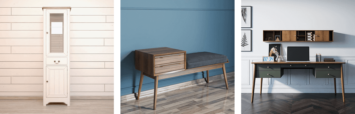 Все предметы производятся на заказ из разных сортов дерева. Например, зеркала для ванной комнаты обрамляют в дуб, бук или ясень, для жилых комнат — в бюджетную сосну.