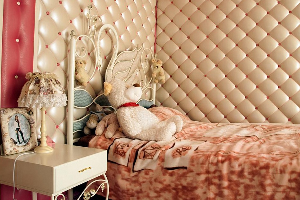 - Для спальни обычно выбирают легкие синтепоновые панели. Ими обивают какой-то участок комнаты, например, зону над изголовьем кровати. Как правило, этот тип отделки совпадает по тону с оттенком штор и обоев либо, наоборот, выступает контрастом. Часто для дизайна выбирают текстильные или кожаные изделия спокойных оттенков. Более прочные поролоновые и полиуретановые изделия хорошо смотрятся и долго служат в гостиной, в детской, а также в спортивных залах. Эти разновидности панелей более объемные по сравнению с синтепоновыми.