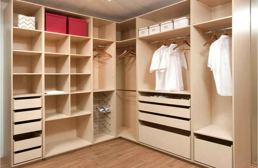 подразумевает размещение полезных конструкций вдоль одной широкой и одной узкой стены. Представляет собой расширенный вариант линейной конструкции с дополнительными полками и местом для переодевания.