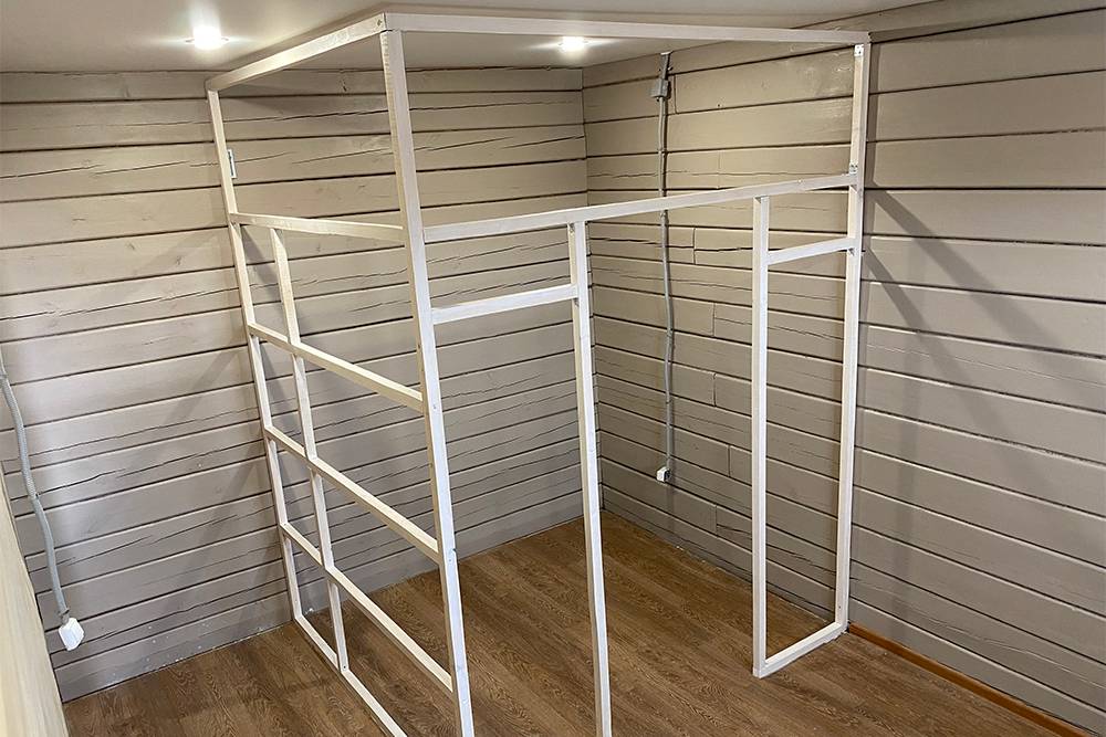 Следом закрепил к полу горизонтальные бруски, а к ним — все остальные опорные стойки. Для усиления каркаса добавил перемычки, некоторые из них будут служить для крепления гардеробных систем.