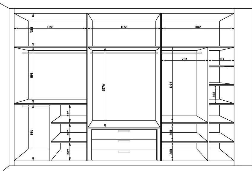 После создания эскиза гардеробной уже можно выщитать размеры корпусной мебели. Стоит помнить, что не только ширина и глубина играет роль, но также и высота.