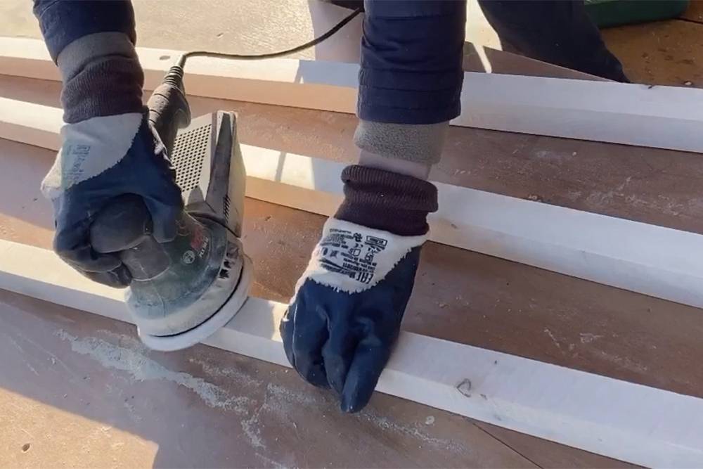 Струбцинами я зажал направляющую на расстоянии 40 мм от диска, чтобы получить нужный размер, и начал пилить. Сделал 15 брусков длиной по 3 м, затем отшлифовал их машинкой.