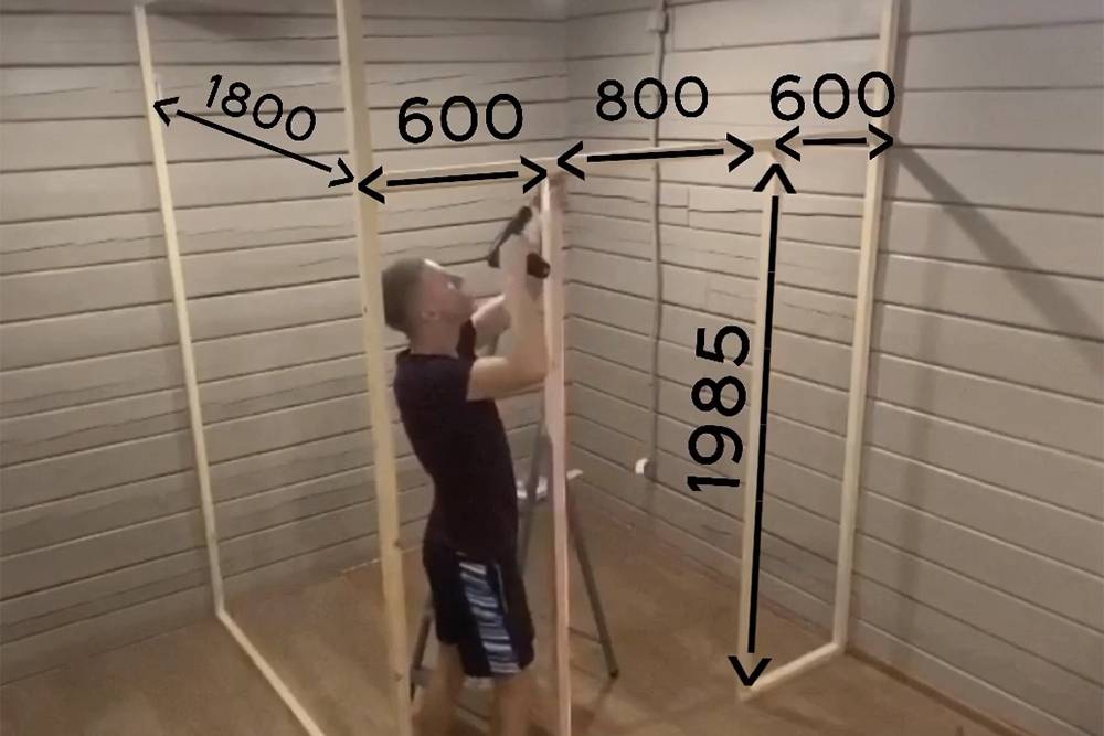 Размеры гардеробной по плану — 200 × 180 см. Отталкиваясь от этого, я уже в доме нарезал бруски нужного размера обычной ножовкой.
