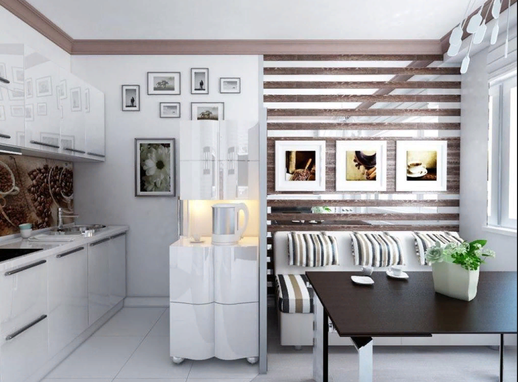 - позволяет разделить комнату на несколько зон, например, для готовки или в столовой.