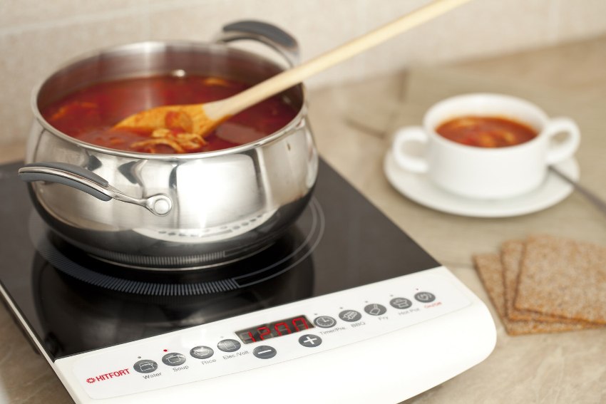 Настольные приборы индукционного типа подойдут людям, которые предпочитают скоростную готовку. Этот вариант дороже, чем предыдущие, его стоимость составляет от 2500 рублей до 50000 рублей. Поверхность выполнена из стеклокерамики, под которой расположена индукционная катушка. Плита этого типа поддерживает постоянную температуру, заданную пользователем, что дает ей дополнительное преимущество относительно газовых или электрических приборов с чугунными и спиральными конфорками.