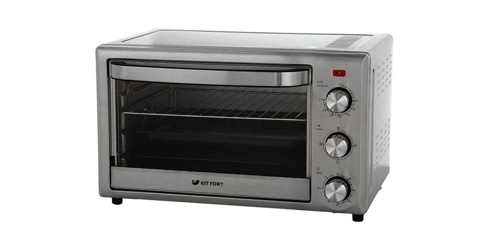 Открывает наш обзор мини-печь Kitfort КТ-1702, которая имеет габариты микроволновки и большой функционал, позволяющий ей справляться с приготовлением выпечки, мяса, курицы, рыбы и других блюд. Снабженная дверцей с прозрачным стеклом, модель имеет два нагревательных элемента, смонтированные в духовой камере сверху и снизу. Включать их можно независимо друг от друга, при этом электропечь поддерживает три основных режима: нагрев сверху, нагрев снизу, нагрев сверху и снизу с конвекцией. Способная разогревать, размораживать, запекать продукты, настольная электропечь Kitfort КТ-1702 с презентабельным корпусом управляется с помощью поворотных переключателей на передней панели. Она получила вращающийся вертел и встроенный гриль для приготовления сочного мяса. Комплектация такого кухонного прибора включает два противня, решетку, вертел, ручку для шампура, ручку для противня и решетки.